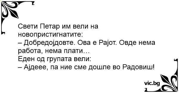 – Добредојдовте. Ова е Рајот. Овде нема работа, нема плати…