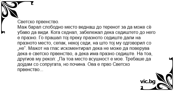 Маж барал слободно место веднаш до теренот за да може сè убаво да види. Кога седнал, забележал дека седиштето до него е празно. Го прашал тој преку празното седиште дали на празното место, сепак, некој седи, на што тој му одговорил со „не“. Мажот на глас искоментирал дека не може да поверува дека е светско првенство, а дека има празно седиште. На тоа, другиов му рекол: „Па тоа место всушност е мое. Требаше да дојдам со сопругата, но почина. Ова е прво Светско првенство откако сме венчани, а да не сме заедно.