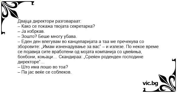 – Еден ден влегувам во канцеларијата а таа ме пречекува со зборовите: „Имам изненадување за вас“ – и излезе. По некое време се појавија сите вработени од мојата компанија со цвеќиња, бонбони, коњаци… Скандираа: „Среќен роденден господине директоре“…