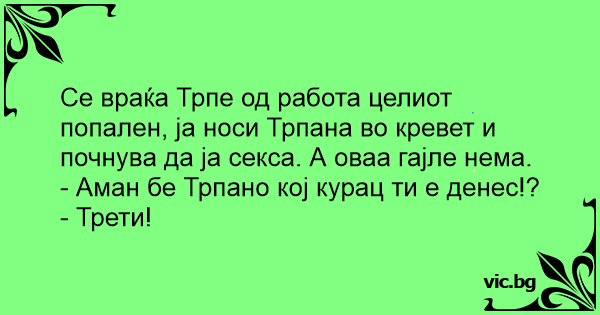Се враќа Трпе од работа целиот попален, ја носи Трпана во кревет и почнува да ја cekca. А оваа гајле нема.