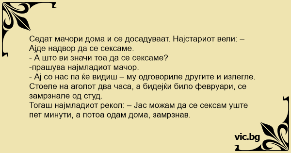 Седат мачори дома и се досадуваат. Најстариот вели: – Ајде надвор да се сексаме.
