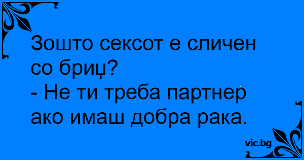 Разговараат двајца пријатели: - Сексот е исто како бриџ. - ??? - Ако немаш добар партнер, тогаш подобро е да имаш добра рака.