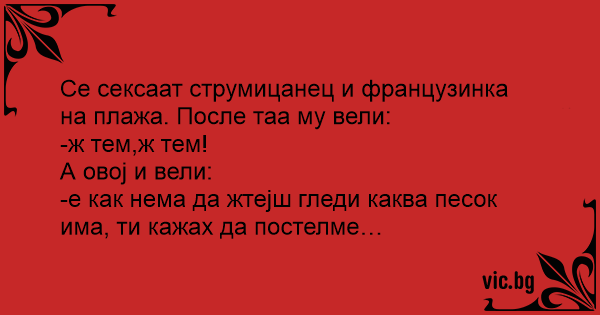 Се сексаат струмицанец и французинка на плажа. После таа му вели: