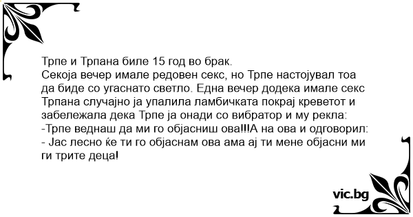 Секоја вечер имале редовен cekc, но Трпе настојувал тоа да биде со угаснато светло. Една вечер додека имале cekc Трпана случајно ја упалила ламбичката покрај креветот и забележала дека Трпе ја онади со bибpatop и му рекла: