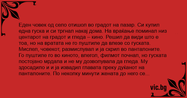 Еден човек од село отишол во градот на пазар. Си купил една гуска и си тргнал накај дома. На враќање поминал низ центарот на градот и гледа – кино. Решил да види што е тоа, но на вратата не го пуштиле да влезе со гуската. Мислел, човекот, размислувал и ја скрил во панталоните.