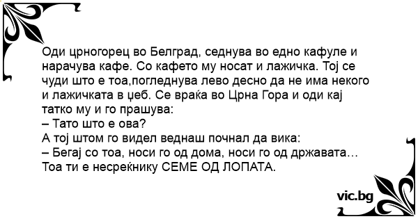 Оди црногорец во Белград, седнува во едно кафуле и нарачува кафе. Со кафето му носат и лажичка. Тој се чуди што е тоа,погледнува лево десно да не има некого и лажичката в џеб. Се враќа во Црна Гора и оди кај татко му и го прашува: