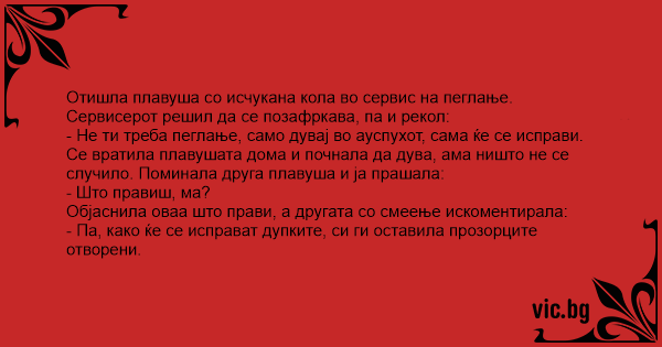 Се вратила плавушата дома и почнала да дува, ама ништо не се случило. Поминала друга плавуша и ја прашала: