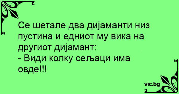 Се шетале два дијаманти низ пустина и едниот му вика на другиот дијамант: