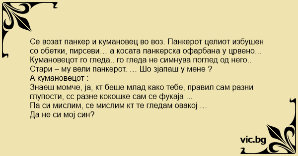 Се возат панкер и кумановец во воз. Панкерот целиот избушен со обетки, пирсеви… а косата панкерска офарбана у црвено...