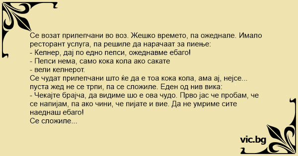 - Келнер, дај по едно пепси, ожеднавме ебаго!