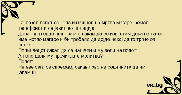 Се возел попот со кола и наишол на мртво магаре, земал телефонот и се јавил во полиција: