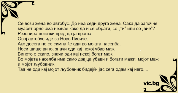 Се вози жена во автобус. До неа седи друга жена. Сака да започне муабет арно ама незнае како да и се обрати, со „ти“ или со „вие“?