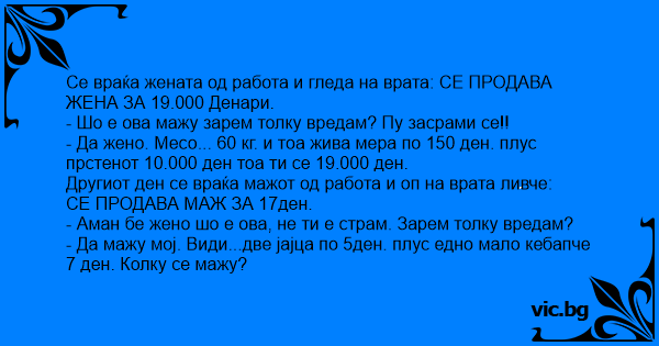 Се враќа жената од работа и гледа на врата: СЕ ПРОДАВА ЖЕНА ЗА 19.000 Денари. - Шо е ова мажу зарем толку вредам? Пу засрами се!! - Да жено. Месо... 60 кг. и тоа жива мера по 150 ден. плус прстенот 10.000 ден тоа ти се 19.000 ден. Другиот ден се враќа мажот од работа и оп на врата ливче: СЕ ПРОДАВА МАЖ ЗА 17ден. - Аман бе жено шо е ова, не ти е страм. Зарем толку вредам? - Да мажу мој. Види...две јајца по 5ден. плус едно мало кебапче 7 ден. Колку се мажу?