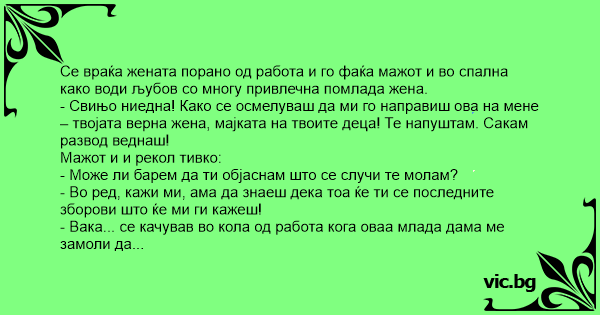 - Свињо ниедна! Како се осмелуваш да ми го направиш ова на мене – твојата верна жена, мајката на твоите деца! Те напуштам. Сакам развод веднаш!