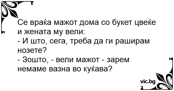 Се враќа мажот дома со букет цвеќе и жената му вели: