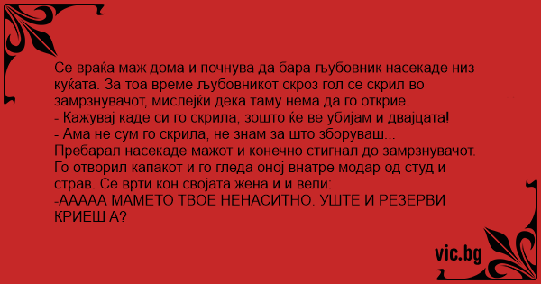 Пребарал насекаде мажот и конечно стигнал до замрзнувачот. Го отворил капакот и го гледа оној внатре модар од студ и страв. Се врти кон својата жена и и вели: