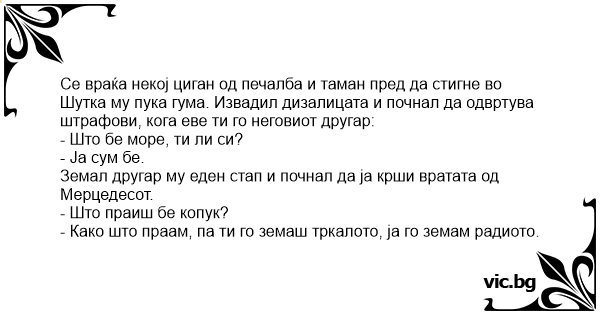 Пука се гумата, шофьорът слиза, вади крик от багажника и започва да сваля колелото. Любопитен минувач спира до колата. - Какво става? - Как какво? Свалям колелото. Минувачът взема щангата и прасва...