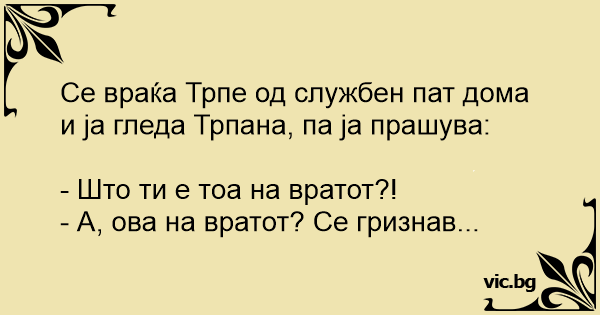 Се враќа Трпе од службен пат дома и ја гледа Трпана, па ја прашува: