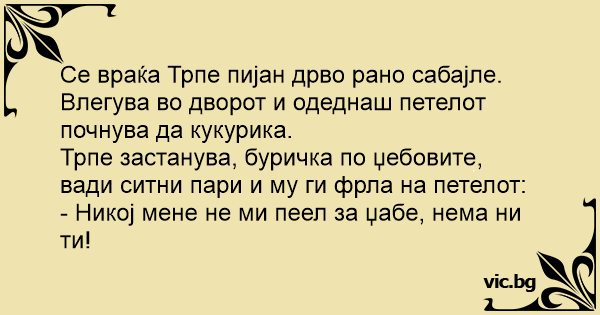 Трпе застанува, буричка по џебовите, вади ситни пари и му ги фрла на петелот: