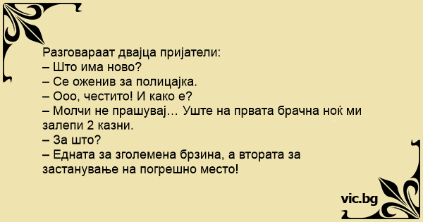 – Молчи не прашувај… Уште на првата брачна ноќ ми залепи 2 казни.