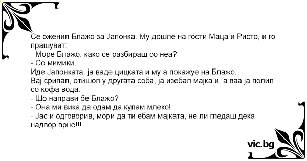 Се оженил Блажо за Јапонка. Му дошле на гости Маца и Ристо, и го прашуват: