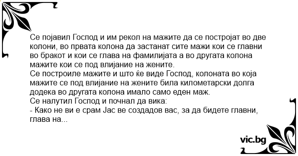 Се појавил Господ и им рекол на мажите да се постројат во две колони, во првата колона да застанат сите мажи кои се главни во бракот и кои се глава на фамилијата а во другата колона мажите кои се под влиjание на жените.