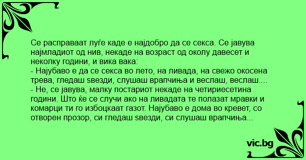 Се расправаат луѓе каде е најдобро да се cekca. Се јавува најмладиот од нив, некаде на возраст од околу давесет и неколку години, и вика вака: