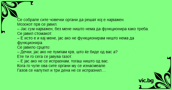 Organele omului hotarasc sa-si aleaga un sef. Este propus creierul ca e cel mai important, cel mai destept... Inima sare si ea: - Daca nu sint eu sa pompez singe, creierul ar fi mort... Plaminii...