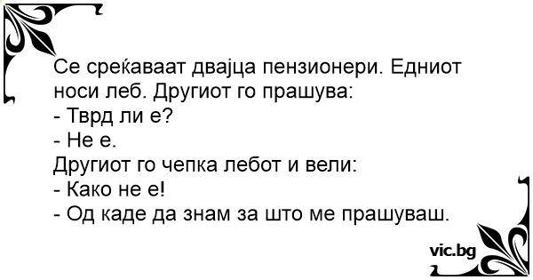Се среќаваат двајца пензионери. Едниот носи леб. Другиот го прашува: