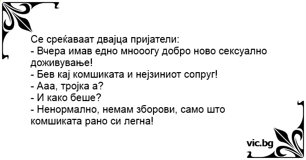 - Ненормално, немам зборови, само што комшиката рано си легна!