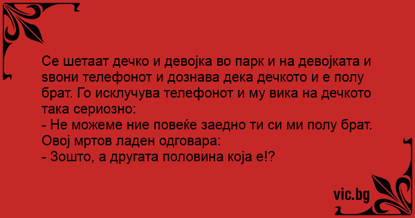 Се шетаат дечко и девојка во парк и на девојката и ѕвони телефонот и дознава дека дечкото и е полу брат. Го исклучува телефонот и му вика на дечкото така сериозно: