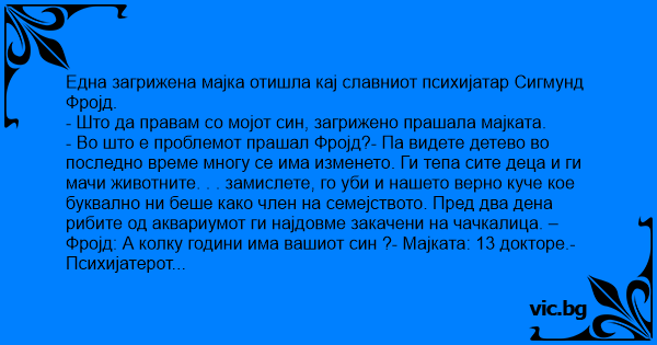 - Во што е проблемот прашал Фројд?- Па видете детево во последно време многу се има изменето. Ги тепа сите деца и ги мачи животните. . . замислете, го уби и нашето верно куче кое буквално ни беше како члeн на семејството. Пред два дена рибите од аквариумот ги најдовме закачени на чачкалица. – Фројд: А колку години има вашиот син ?- Мајката: 13 докторе.- Психијатерот Фројд дискретно го погледнал детето и откако поразговарал со него рекол: Госпоѓо, вашето дете е на почетокот од пубертетот. Па, во овој период насилството е нормално за повеќе деца на негова возраст .Тоа не е некаков проблем.Ви благодарам докторе. . .