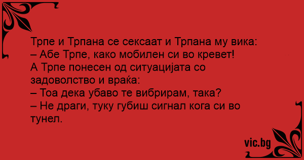 Сексат се Пена и Вуте, па тя рекла: -"Знаеш ли Вуте,че си като мобилен телефон у кревато?” -"Какво, толко ли убаво вибрирам?" -”Ма не бре, губиш сигнало у тунело!”