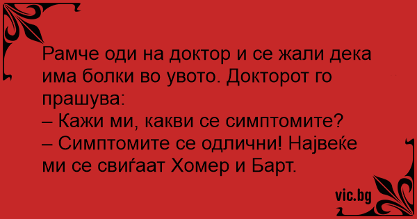 Рамче оди на доктор и се жали дека има болки во увото. Докторот го прашува: