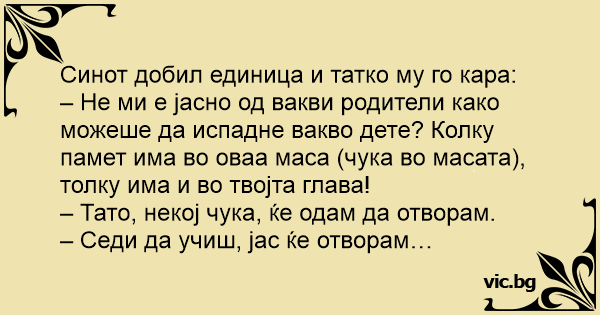 – Не ми е јасно од вакви родители како можеше да испадне вакво дете? Колку памет има во оваа маса (чуka во масата), толку има и во твојта глава!