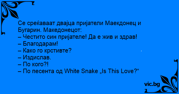 Се среќаваат двајца пријатели Маекдонец и Бугарин. Македонецот: