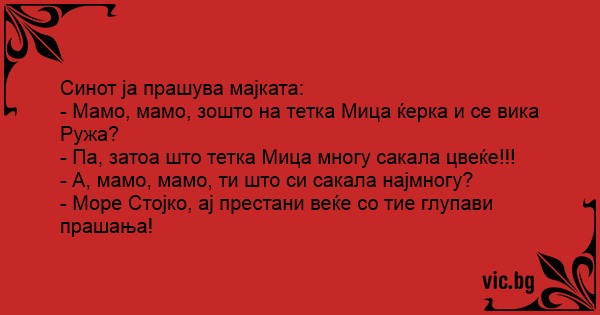- Мамо, мамо, зошто на тетка Мица ќерка и се вика Ружа?