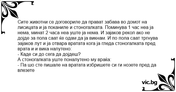 Сите животни се договориле да прават забава во домот на лисицата и ја поканиле и стоногалката. Поминува 1 час неа ја нема, минат 2 часа неа уште ја нема. И зајаков рекол ако не дојде за пола саат ќе одам да ја викнам. И по пола саат тргнува зајаков лут и ја отвара вратата кога ја гледа стоногалката пред врата и и вика налутено:
