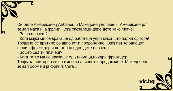 Си биле Американец,Албанец и Македонец во авион. Американецот земал маса и ја фрлил. Кога слетале,виделе дете како плаче: