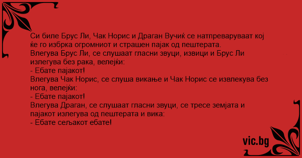 Си биле Брус Ли, Чак Норис и Драган Вучиќ се натпреваруваат кој ќе го избрка огромниот и страшен пајак од пештерата.