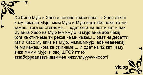 Си биле Мујо и Хасо и носеле тежок пакет и Хасо дткал и му вика на Мујо: ммм Мујо и Мујо вика абе чекај ќе ми кажеш кога ке стигнеме.... одат сега на петти кат и пак му вика Хасо на Мујо Ммммујо и мујо вика абе чекај кога ќе стигнеме ти реков ќе ми кажеш... одат на десетти кат и Хасо му вика на Мујо, Ммммммујо абе чееееекај ќе ми кажеш кога ќе стигнеме.... И одат на 12 кат и му вика мммм Мујо и овој ШТО? ггг го зззаборраааввиииввммее кккклллуууччччооот!