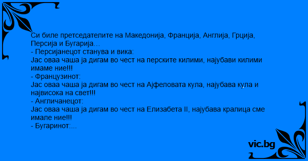 Јас оваа чаша ја дигам во чест на крали марко, што имал cekc со елизабета под ајфеловата кула, на убав персијски килим со убава бугарска музика. Ако не ми верувате прочитајте во грчката литература !!!