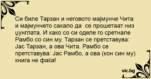 Си биле Тарзан и неговото мајмунче Чита и мајмунчето сакало да се прошетаат низ џунглата. И како со си оделе го сретнале Рамбо со син му. Тарзан се претставува: Јас Тарзан, а ова Чита. Рамбо се претставува: Јас Рамбо, а ова (кон син му) книга не фаќа!