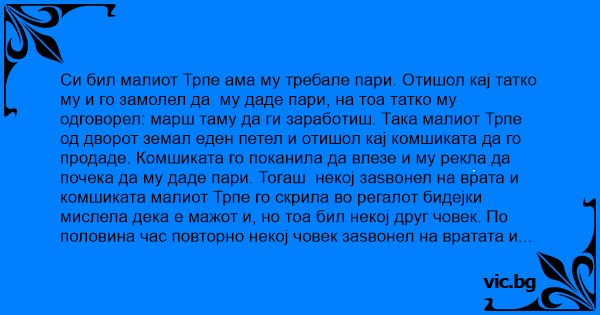 " тато тато види колку пари собрав за петелот" а на тоа татко му одговорил " аман доста еден копиљ цела вечер ми продаваше еден петел"
