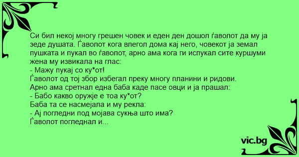 Си бил некој многу грешен човек и еден ден дошол ѓаволот да му ја зеде душата. Ѓаволот кога влегол дома кај него, човекот ја земал пушката и пукал во ѓаволот, арно ама кога ги испукал сите куршуми жена му извикала на глас: