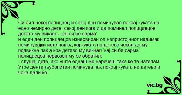 Си бил некој полицаец и секој ден поминувал покрај куќата на едно немирно дете, секој ден кога и да поминел полицаецов, детето му викало- ‘кај си бе сарма‘