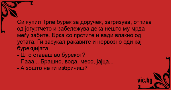 Си купил Трпе бурек за доручек, загризува, отпива од јогуртчето и забележува дека нешто му мрда меѓу забите. Брка со прстите и вади влакно од устата. Ги засукал ракавите и нервозно оди кај бурекџијата: