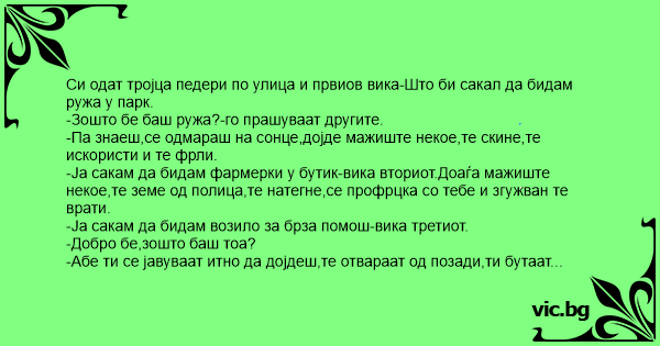 Си одат тројца педери по улица и првиов вика-Што би сакал да бидам ружа у парк.