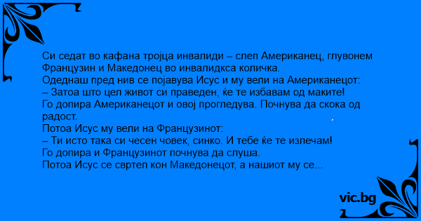 Си седат во кафана тројца инвалиди – слеп Американец, глувонем Французин и Македонец во инвалидкса количка.