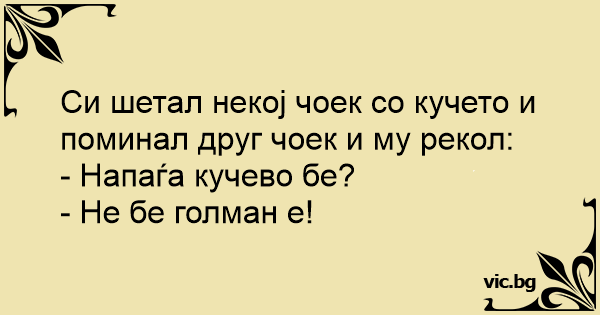 Си шетал некој чоек со кучето и поминал друг чоек и му рекол: